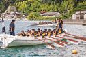 力合わせ「いっち、にー」 隠岐水産高、恒例のカッター漕艇訓練