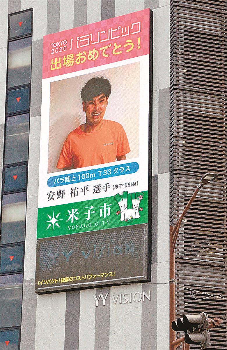 東京パラリンピック陸上男子100メートル(脳性まひT33=車いす)に出場する米子市出身の安野祐平選手(31)=楽志、鳥取県立鳥取聾(ろう)学校出=を応援する画像が20日、市中心市街地の大型ビジョンで流れ始めた。競技がある30日までの予定。