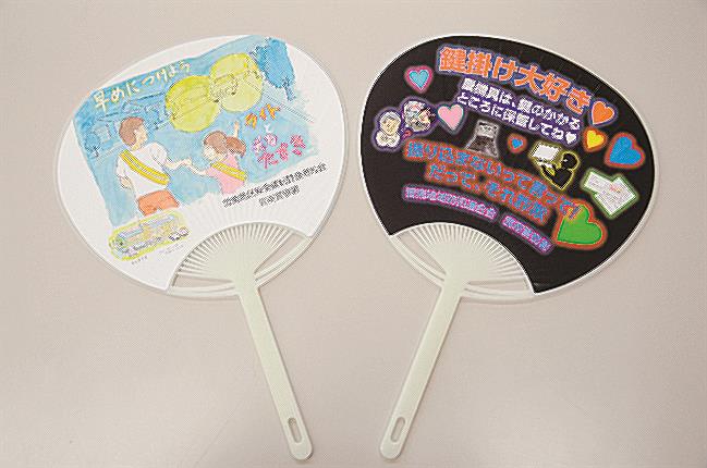 うちわは片面を担当。夜光反射材を着けて歩く親子とライトを点灯させた車を描いて「早めにつけよう ライトと光るたすき」とのメッセージを入れ、雲南署のイラストを添えた。もう一方の面は鍵掛けや振り込め詐欺への注意を喚起する内容になっている。