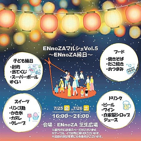 夜も明るいENnoZAで、子ども縁日やおいしいフードとドリンクを集めた縁日マルシェを開きます。