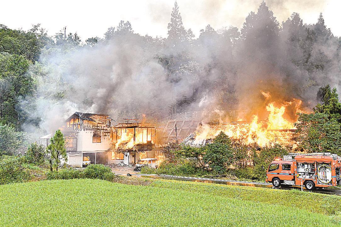 22日午後4時ごろ、浜田市金城町久佐の無職男性(71)方から出火し、木造一部2階建ての母屋と納屋計約518平方メートルを全焼し、隣接する平屋倉庫の一部を焼いた。男性さんは妻と2人暮らしで、共に外出しており、けが人はいなかった。