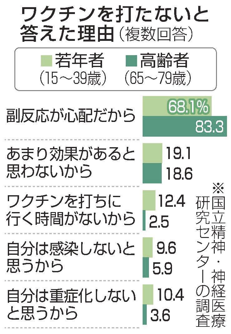 A 接種に消極的な人が多いことです。国立精神・神経医療研究センターの調査では、避けたいと答えた若年者(15~39歳)は15%で、高齢者(65~79歳、6%)の2倍以上でした。