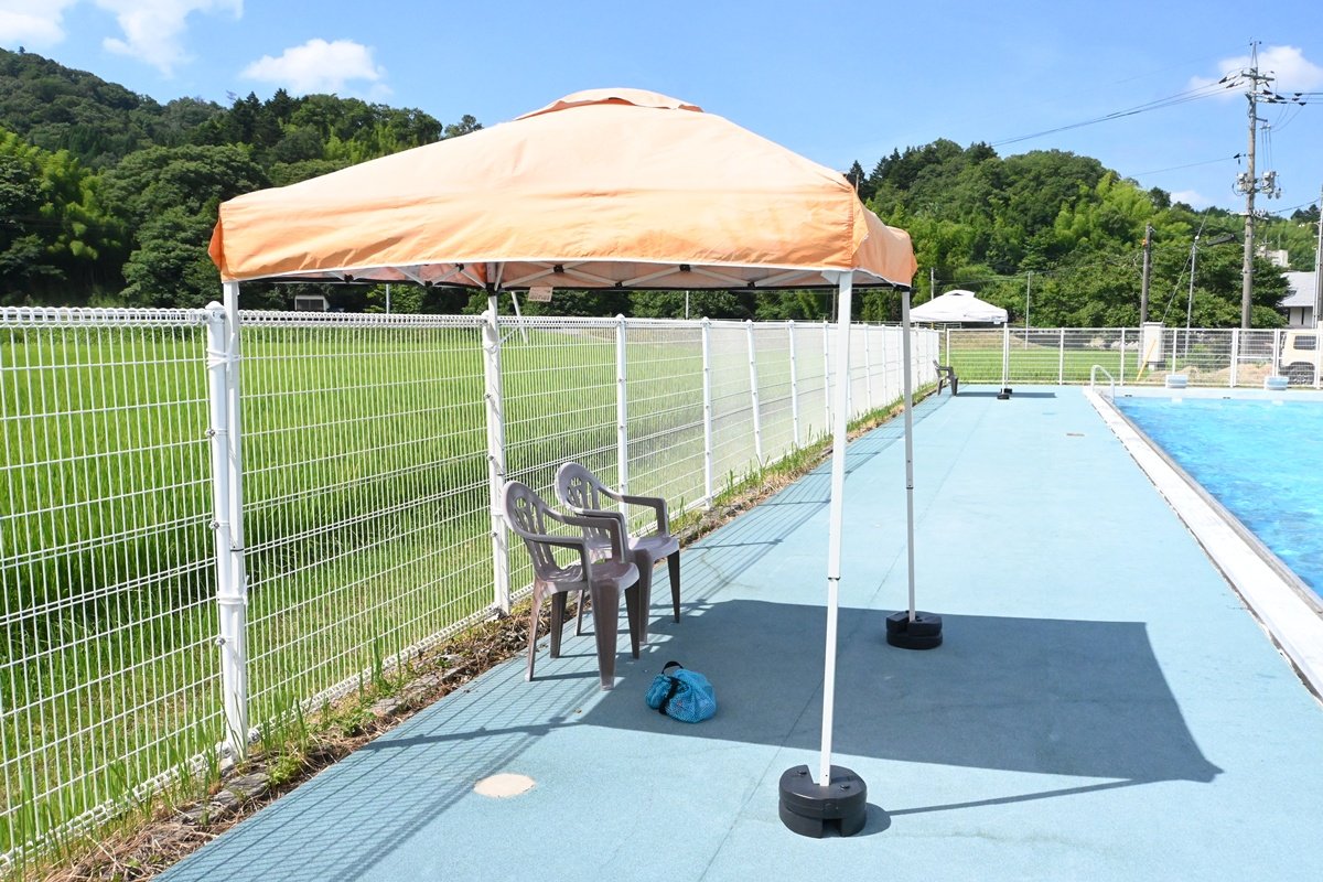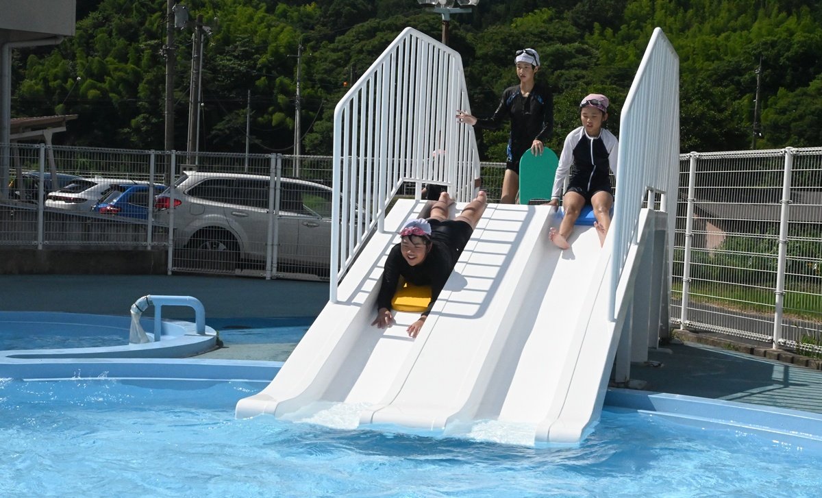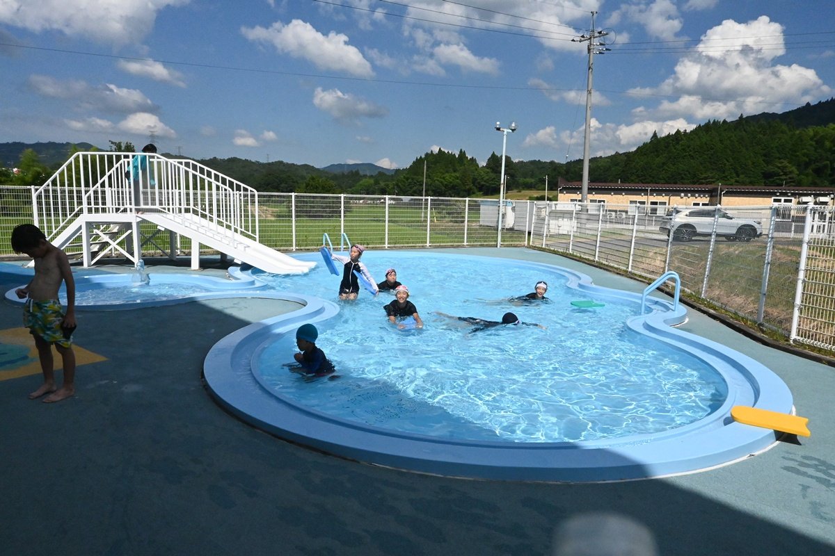 毎年夏に開かれる屋外プールで、通称・比田のプール。無料で利用でき、滑り台や子ども用の浅いプールも完備する。