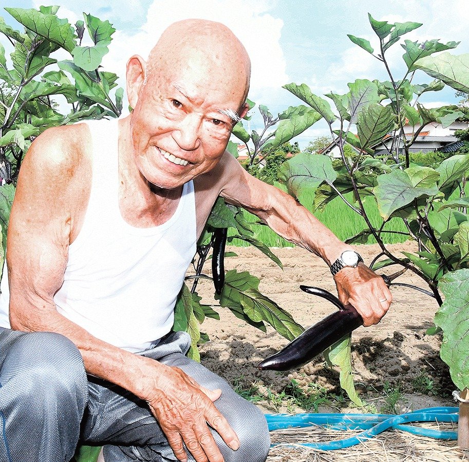 出雲市斐川町名島の佐藤豊さん(92)の畑で、腕が生えてきたような不思議な形のナスができ、このほど収穫し、地元の保育園に贈った。