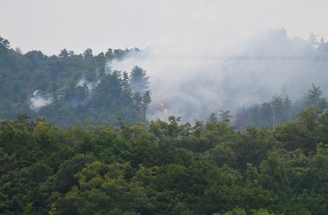 現場近くの70代農業男性は立ち上る白煙に「梅雨明け以降まとまった雨が降っておらず、生木が焼けているのだろう。不安な一夜を過ごすことになる」と話した。