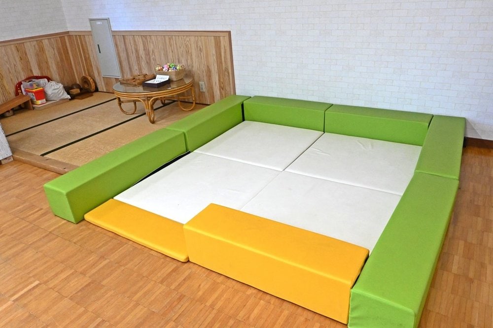 キッズコーナーではパズルなどおもちゃで遊ぶ。授乳室も完備し乳幼児連れでも安心だ。外は整備されたてんぐの森がありハイキングや自然を気軽に楽しむ。