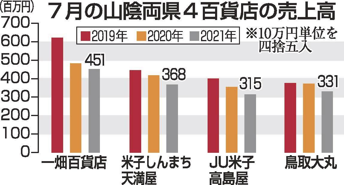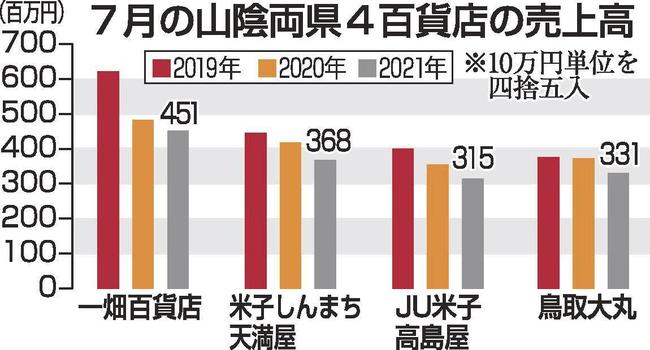 中国四国百貨店協会が23日発表した山陰両県4店の7月の売上高は前年同月比10・0%減の14億6500万円で、2カ月連続で前年を下回った。2019年同月と比べると20・6%減。上旬の豪雨に加え、中海圏域での新型コロナウイルスの感染拡大で客足が遠のいた。