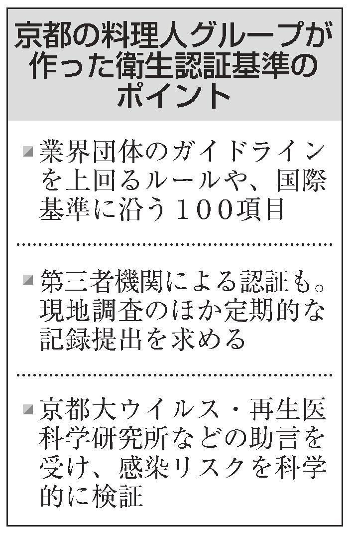 京都の老舗料亭の料理人らが、新型コロナウイルス対策の衛生認証基準を独自に作成した。業界団体のガイドラインを上回るルールや、国際基準に沿う100項目で「最高水準の厳しさ」との位置付け。第三者機関による認証の仕組みも設け、年内に府内100店舗での導入を目指す。感染が拡大する中、安心して来店してもらうのが狙い。