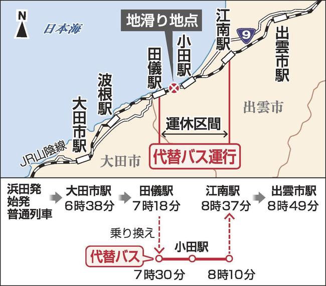 出雲市多伎町での地滑りに伴うJR山陰線の一部運休で、大田市などから出雲市内の高校に通う際、始発に乗っても始業に間に合わない事態になっている。田儀-小田-江南の運休区間の代替バスと、田儀駅(多伎町口田儀)や江南駅(湖陵町三部)での列車の接続が良くないのが一因。8月末にかけて出雲市内で始業が本格化するだけに、早急な対応が必要だ。 (松本直也)