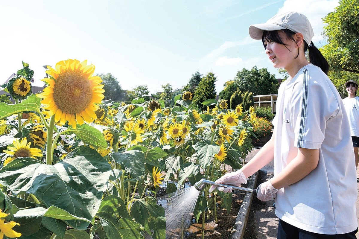 21年に、宮古から復興のシンボルとして育てたヒマワリの種が出雲に届いたのを契機に毎年、生徒が学校で苗まで育て花の郷に植えている。今年も6月末に80本を植えた。