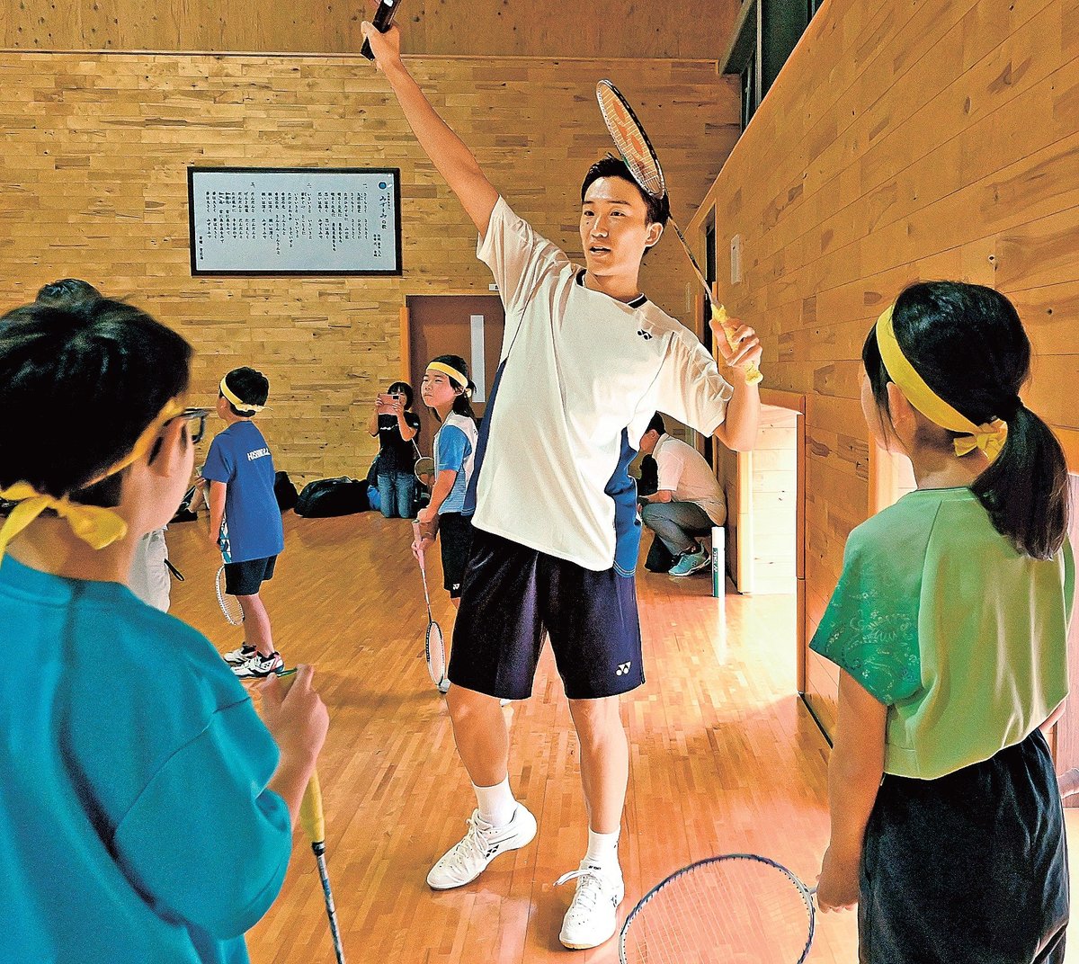 バドミントン男子シングルスの元世界王者、桃田賢斗選手(30)を招いたバドミントン教室が9日、松江市内であり、約30人が上達のこつや試合前の心構えを学んだ。