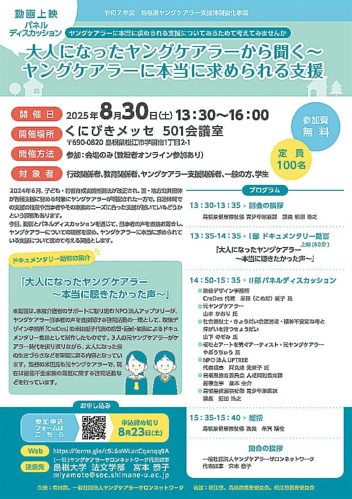 ヤングケアラーへの支援や理解を深めようと、一般社団法人ヤングケアラーサロンネットワークと島根県が主催する。
