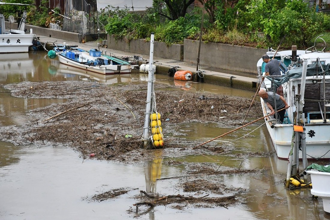 松江地方気象台によると、西郷(隠岐の島町)は11日深夜から12日午前までに80・5ミリの雨量を観測。西郷中心部を流れる八尾川の船着き場には枝や流木が漂着し、住民が取り除いていた。