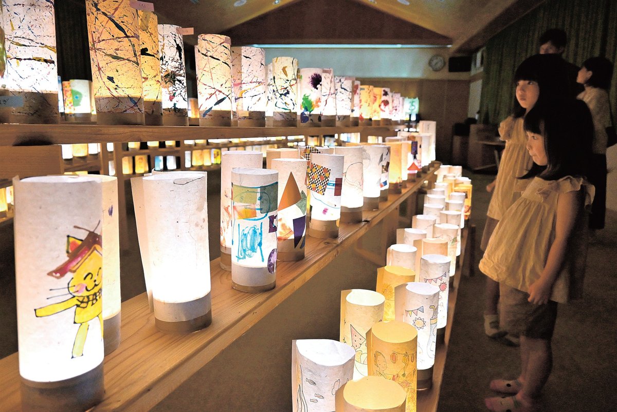 センター内の一室には地元住民や保育所、小学校、専門学校などが協力し、石州和紙で作った灯籠670個が並んだ。ヒマワリの花や夏野菜の絵のほか、犠牲者の名前を書き「平和になりますように」とのメッセージを添えた一作もある。