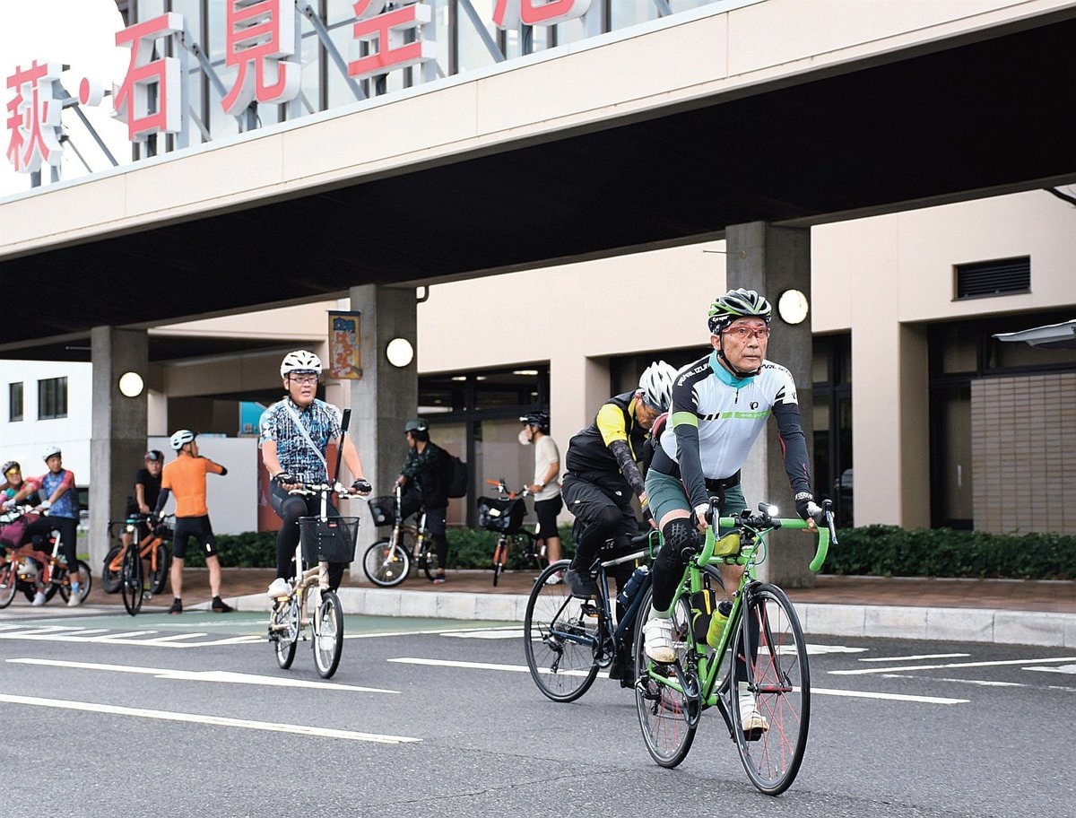 萩・石見空港(益田市内田町)の大阪便を利用したサイクリングツアーが12日、益田市内であり、関西圏から訪れた8人が地元サイクリストと一緒に銀輪を走らせた。