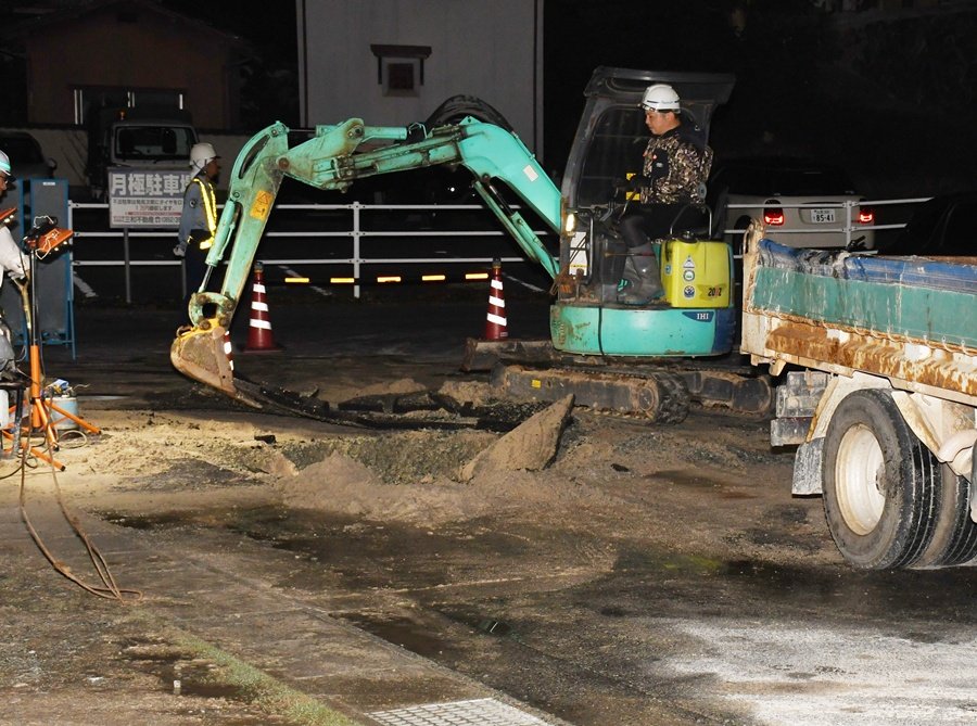 市上下水道局によると、穴は直径約2メートル、深さ約60センチ。水道管はポリエチレン管で劣化が原因とみられるという。同日午後10時現在、付近の約30世帯が断水している。