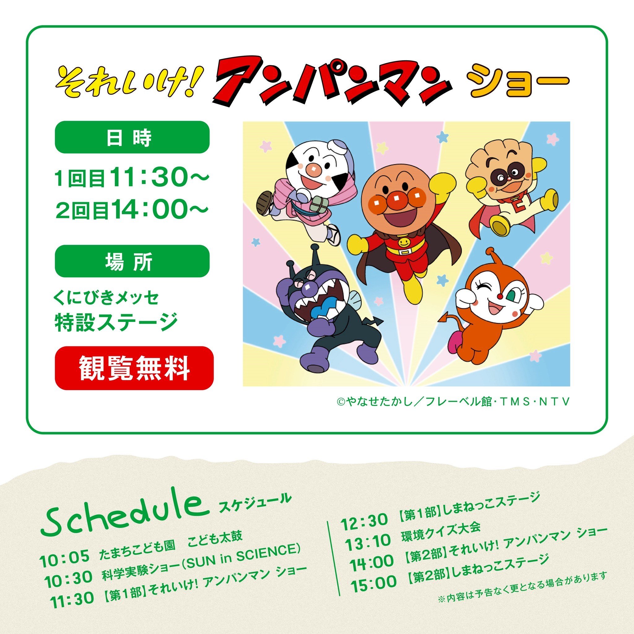 アンパンマンショーや科学実験ショー、しまねっこのステージなど、親子で楽しめるイベントが盛りだくさん。