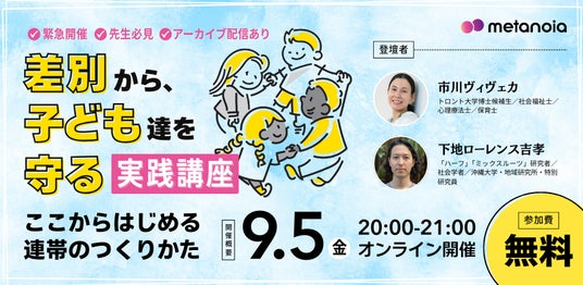 認定NPO法人メタノイア(所在地:東京都足立区、代表理事:山田拓路)は、子どもたちを差別や偏見から守るための行動を促す新しい啓発ビジュアル「子どもたちを差別から守る考え方5選」を公開しました。
