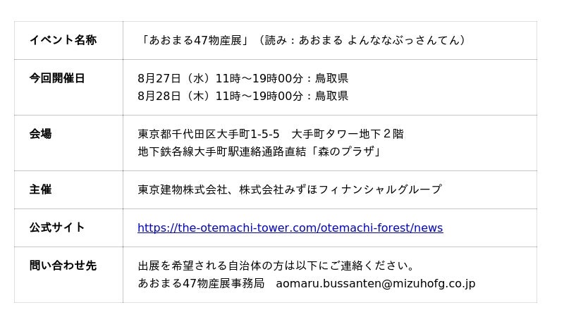 東京建物株式会社と株式会社みずほフィナンシャルグループは、地域創生に向けた取り組みの一環として、日本全国の名産品を集めた「あおまる47物産展」(以下「本物産展」)を大手町タワー(東京都千代田区)内の「森のプラザ」で、2025年1月より定期開催しています。