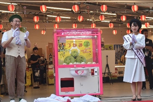 続いて鳥取の郷土芸能である麒麟獅子舞が披露された後、平井県知事とわかとりメイツ横山氏により、今回一番の見どころである「梨クレーンゲーム」の除幕式が行われました。知事自らもクレーンゲームに挑戦し、一発で見事に梨をゲット。「掴んだ梨“なつひめ”は甘くて涼やかな梨。フェス後半に用意させていただく梨“新甘泉(しんかんせん)”は超特急で美味しい味ですよ。」とその魅力をコメントしました。