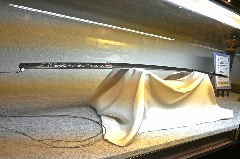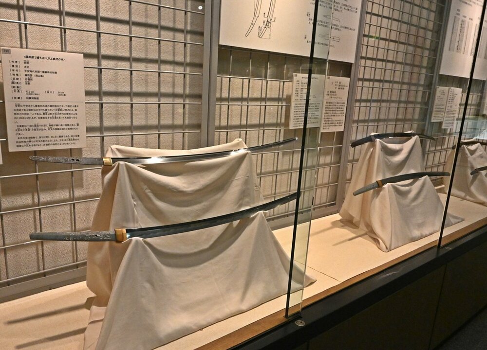精錬した鉄は日本刀の原料になる。日本刀の展示では太刀や刀、脇差しの違いや刃文を比べながら鑑賞する。重さ約1キロ、長さ78センチの刀を実際に持ち記念撮影もできる。中学生以下の場合は模造刀を持って撮影する。