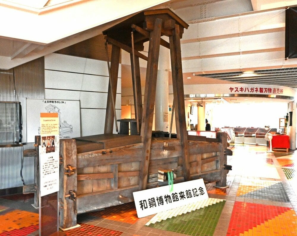 砂鉄を精錬し鉄を取り出すたたら製鉄関連では、炉に風を送る天秤鞴(てんびんふいご)などを展示。明治時代に使われたふいごを踏んで風を起こす体験をする。小さな子ども用のふいごもある。