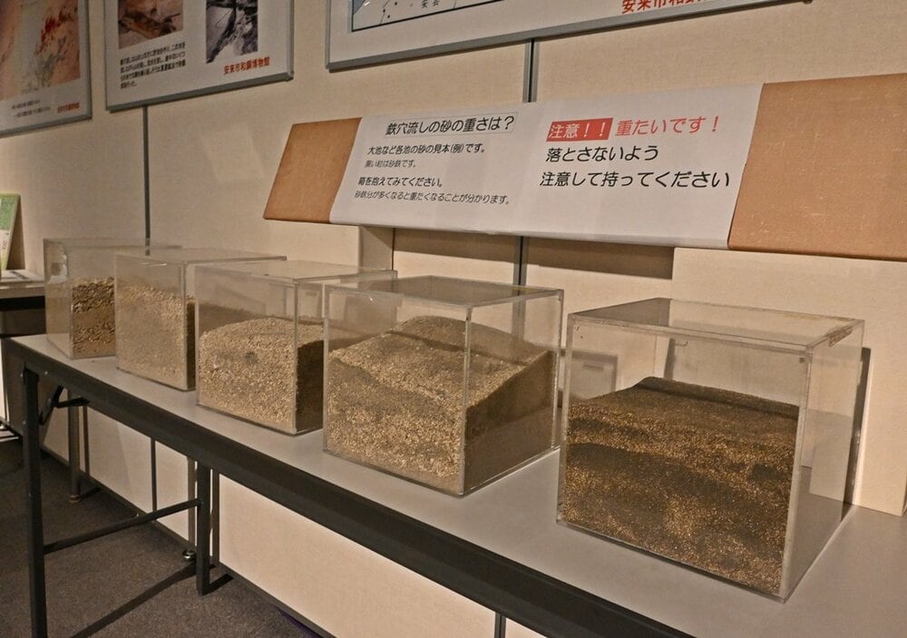 山陰両県でかつて、砂鉄を採取する時に行われていた「鉄穴(かんな)流し」も学べる。砂や土に混じる砂鉄を、川や水路の流れによって土砂と砂鉄に分離させる。鉄穴流しで採取した砂鉄の重さも感じ取れる。