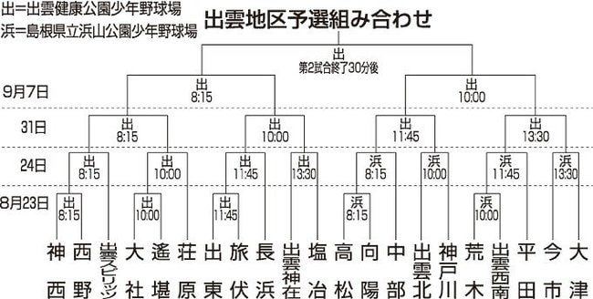 JAカップ第42回島根県学童軟式野球選手権大会(県軟式野球連盟、山陰中央新報社主催、JAしまね、JA共済連島根特別協賛)の出雲地区予選が8月23、24の両日と、31日、9月7日に出雲健康公園少年野球場(出雲市矢野町)などで開かれる。21チームが出場し、優勝チームは10月18、19の両日、松江市営野球場(松江市上乃木10丁目)である県大会の出場権を得る。