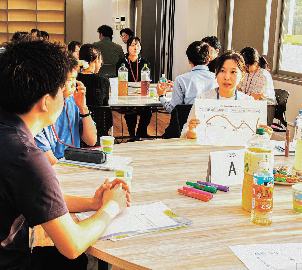テーブルトークでは、若手社員がこれまでの体験をチャート図にして披露。就職活動のエピソードや就職してからの失敗や成功をユーモアを交えて伝えた。参加者からは、就職理由ややりがい、休日取得のしやすさや給与についての具体的な質問が出た。