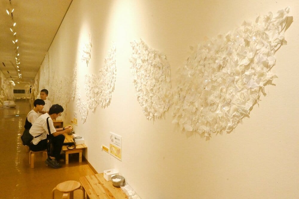 子どもが目いっぱい楽しめる美術館。工作体験で家族一緒に思い出をつくろう。毎週土日と祝日の午後には予約なしで工作できる。タペストリーや万華鏡など内容は毎回変わり、はさみやペンを手に熱中する。