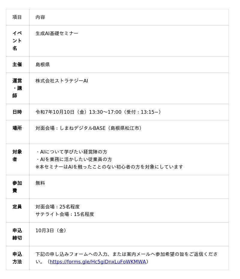 株式会社ストラテジーAI(代表取締役 中尾香達、所在地:島根県松江市)は、島根県からの委託事業として、県内事業者を対象とした「生成AI基礎セミナー」を2025年10月10日(金)13:30~17:00に開催いたします。本セミナーは、「生成AIが何かわからない」「AIについて学びたい」という初心者の方を対象としており、深刻化する人手不足問題の解決や、県内産業の発展に貢献することを目的としています。参加費は無料です。