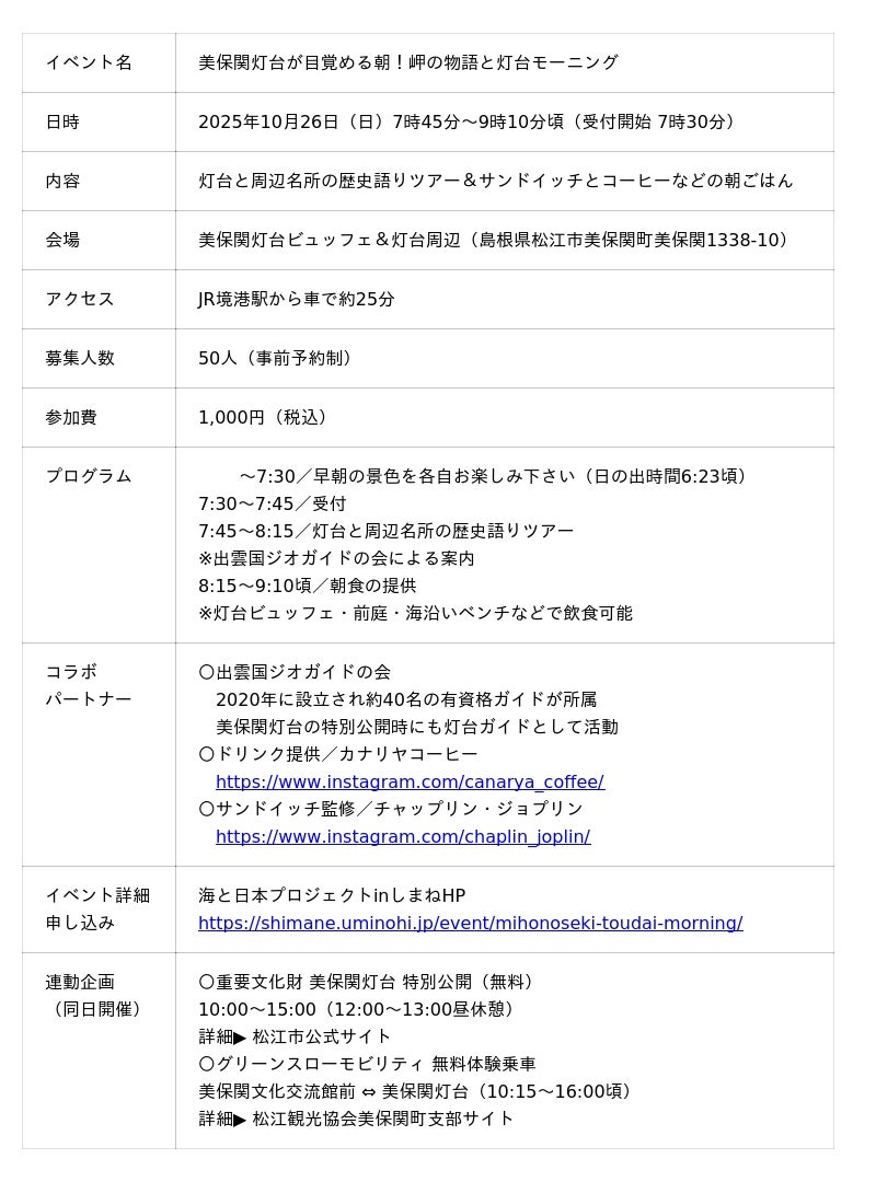 美保関灯台コンソーシアムは、「灯台モーニング」という新しい観光価値や美保関灯台と地蔵崎の魅力を発信すべく、10月26日(日)に「美保関灯台が目覚める朝!岬の物語と灯台モーニング」を開催いたします。このイベントは、日本財団「海と日本プロジェクト」の一環として、灯台を中心に地域の海の記憶を掘り起こし、地域と地域、異分野と異業種、日本と世界をつなぎ、新たな海洋体験を創造していく「海と灯台プロジェクト」の助成を受けて実施します。