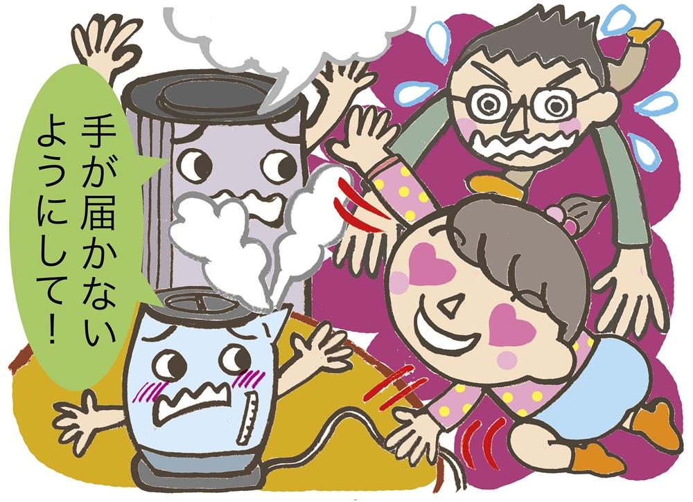 ローテーブルの上に置かれていた電気ケトルの電源コードを乳児が引っ張り、倒れたケトルの湯をかぶった事例も。蒸気に興味を引かれ、加湿器の噴き出し口を手で触ってやけどする事故も起こっている。