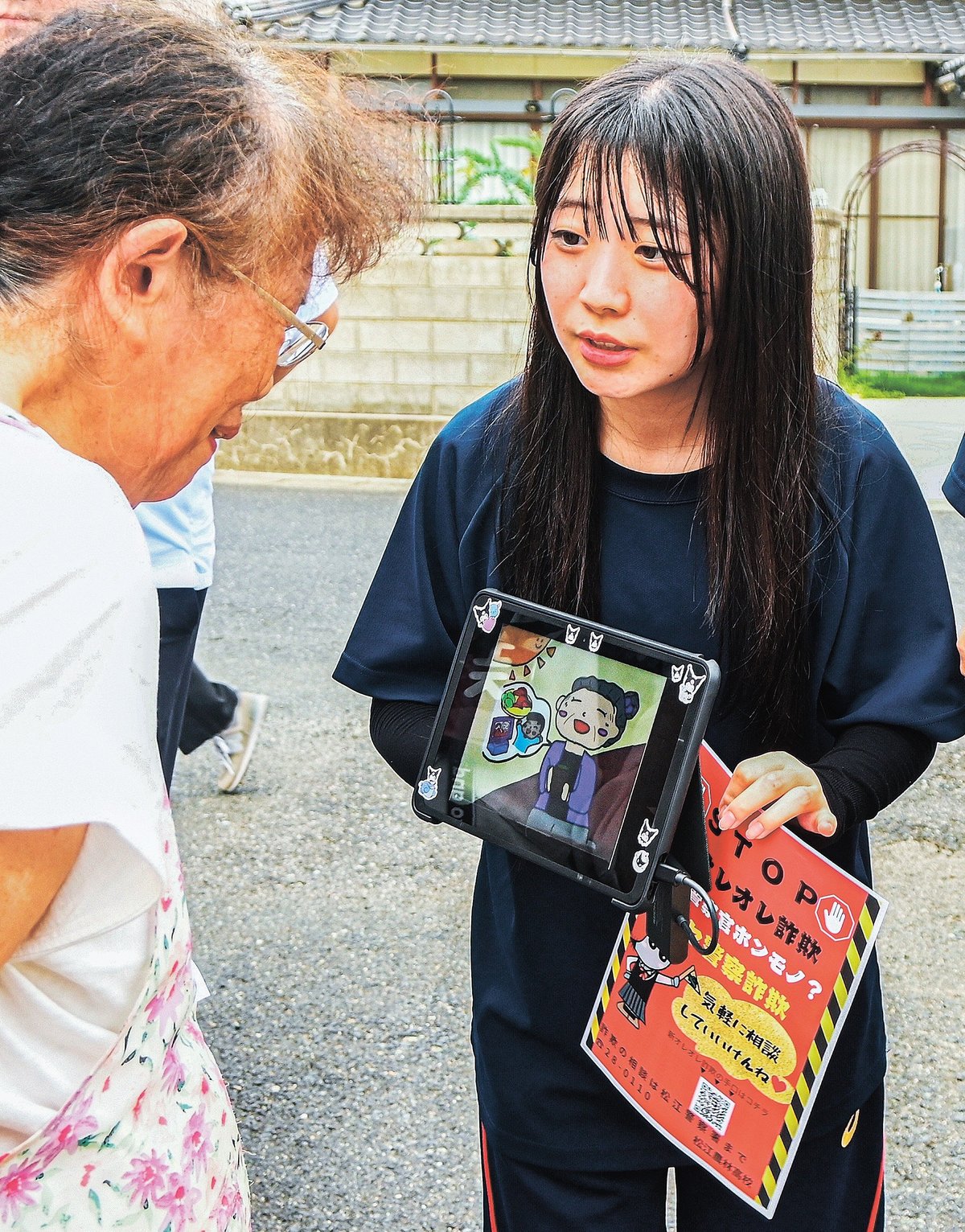 生徒たちは高齢者の詐欺被害が多いためチラシや動画を作って、呼びかけようと考えた。高齢者に見てもらう効果的な方法として、松江署と連携し高齢者などの見守り活動をする移動販売車「とくし丸」でチラシを配ることにした。生徒4人が買い物客らに注意を呼びかけた。