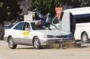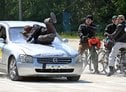 テレビや映画のスタントシーンを演じる「倉田プロモーション」(本社・東京都)の7人が、横断歩道での自転車と歩行者の衝突事故や傘差し、二人乗り、スマートフォンで話しながらの危険な運転などを再現した。見通しの悪い交差点での自動車と自転車の衝突事故では、スタントマンが大きく飛ばされ、生徒は顔をしかめ、「うわ」と驚きの声を上げた。