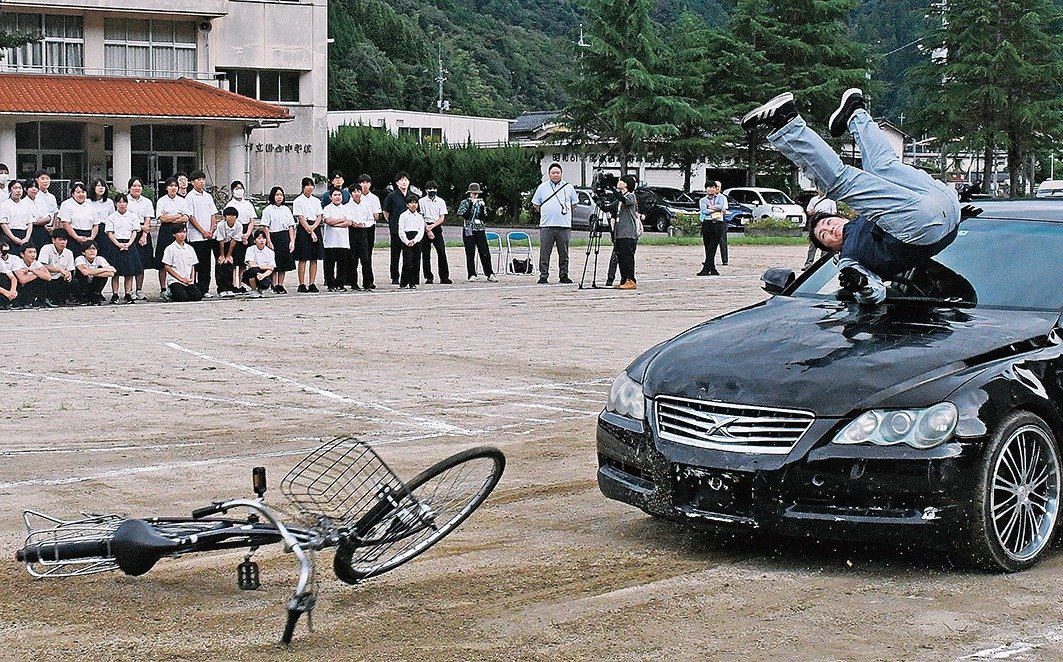 【雲南】プロのスタントマンが自転車事故を再現する交通安全教室が19日、雲南市掛合町掛合の掛合中学校であり、同中学校と三刀屋高校掛合分校の生徒、教職員計約140人が事故の恐ろしさを目の当たりにし、ルール順守を誓った。