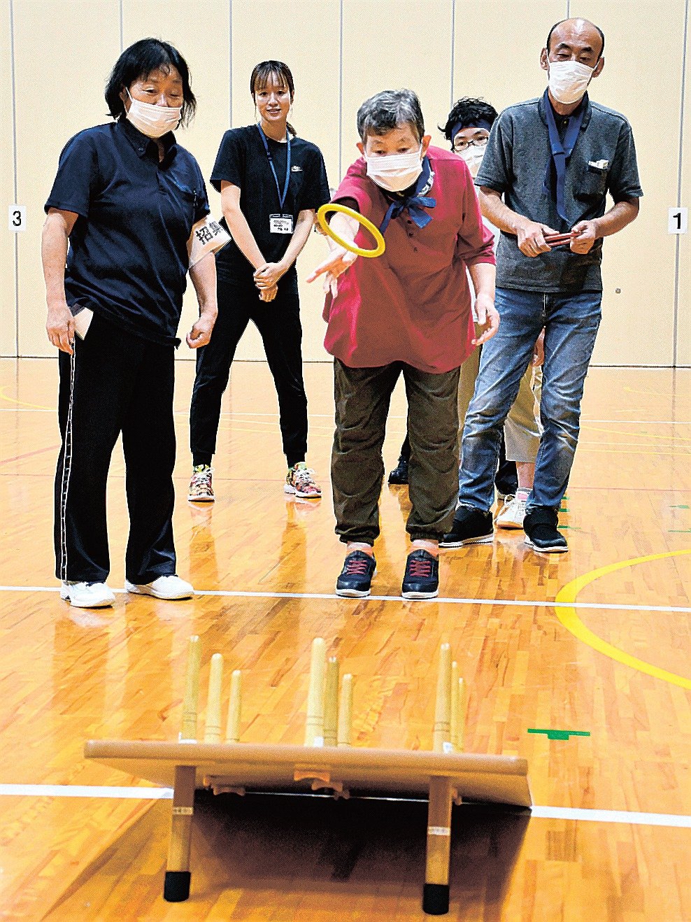 輪投げは1チーム8人編成で行った。選手たちは2メートル先の的棒に向けて輪を投げ、狙い通りに入ると周囲から「おー」という歓声と拍手が送られた。外れても仲間たちが「惜しい」などと励ました。