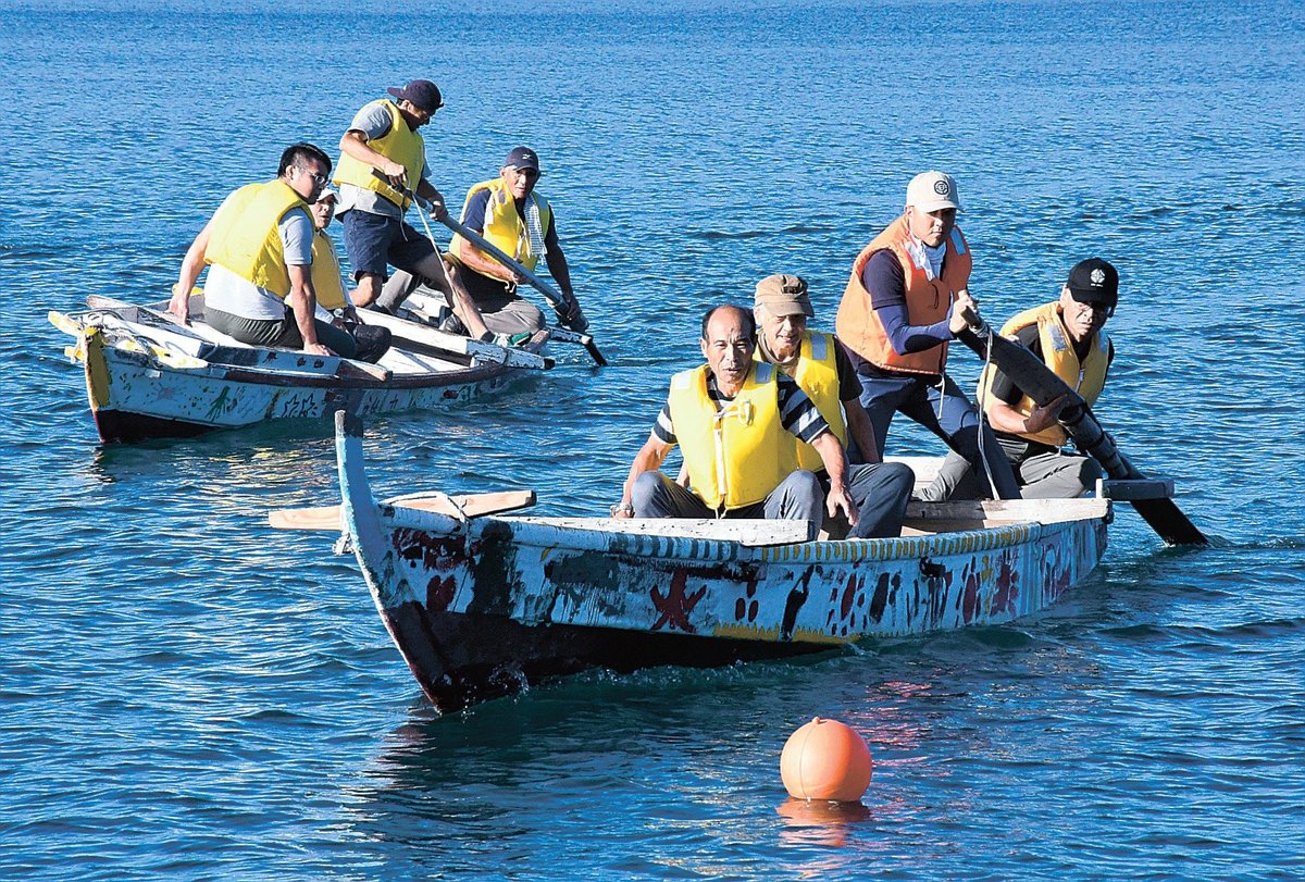競走は3回目で、団体と個人戦で競った。過去最多の18チームと個人9人が出場した。団体戦は200メートルのコースを4人が交代で艪をこいだ。若い移住者は力加減や細やかな操作のこつがつかめず、思わぬ方向に進んで時間をロスしていた。100メートルのタイムを競う個人戦は9人中、8人が60代以上の経験者。少年時代に身に付けた操船技術を生かして圧倒的なスピードと、スムーズな回転で折り返して好記録が相次いだ。