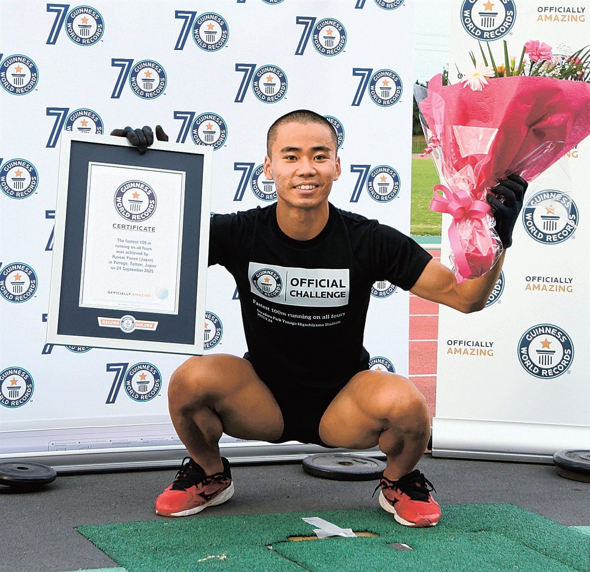 「人類最速」の称号獲得-。米子市三本松2丁目のアルバイト、米江龍星さん(22)が24日、四足走行による100メートル走のギネス世界記録を更新した。記録は現行の15秒66を1秒以上縮める14秒55。約9年間、毎日トレーニングに打ち込んだ成果を発揮し、見事に栄光を手にした。