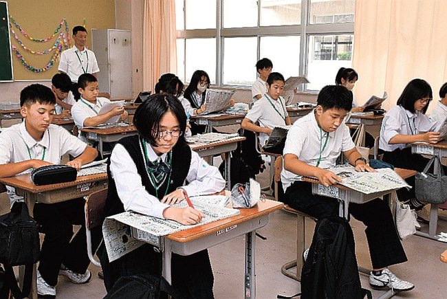 1年生の授業では、当日の山陰中央新報の紙面を見ながら「見出し」「リード」「本文」の役割について説明を聞き、結論を先に書く新聞記事の構成を理解した。