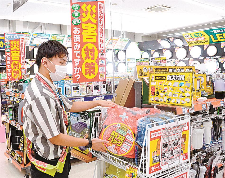 この夏は大雨による河川氾濫や土砂災害の危険を知らせる緊急速報メールのアラームが何度も鳴り響いた。災害に備える意識の高まりから、家電の100満ボルト松江本店(松江市乃白町)では、歯ブラシや携帯トイレなど防災用品30点をセットにした「防災バッグ」が7~8月で前年同期比約1・5倍に。ポータブル電源やモバイルバッテリーの販売数も増えた。