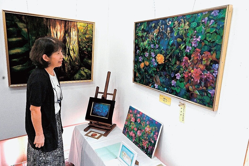 このほか、自分の子どもが生まれた喜びを花と一緒に表現した作品や、枯れ葉や大木などの自然を描いた作品も並ぶ。伊藤さんは「母親の視点で心を込めて描いた作品を見てほしい」と来場を呼びかけた。