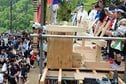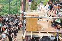 餅を運ぶ氏子や子どもたちが下山佐交流センターから約800メートル離れた神社まで列をつくって進んだ。餅まきが行われた後、ご神体を仮殿から本殿に移した。