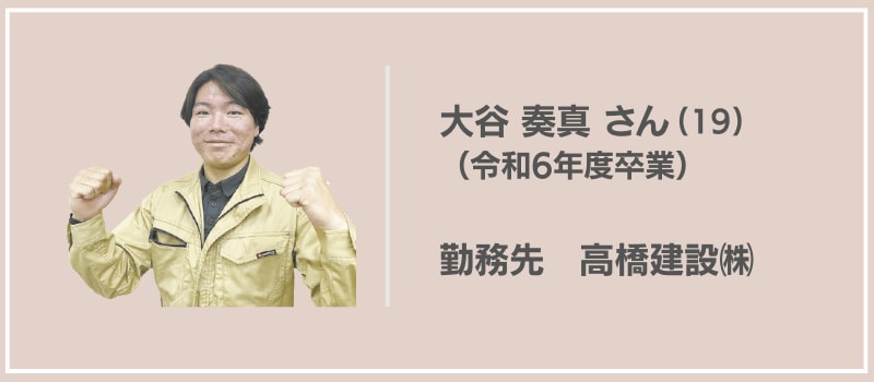 今年の4月から高橋建設で現場管理の仕事をしています。入社後は、戸惑いましたが、測量をする際には高校での知識を生かすことができました。今まで培ってきた知識を土台に今の職場で力をつけたいです。
