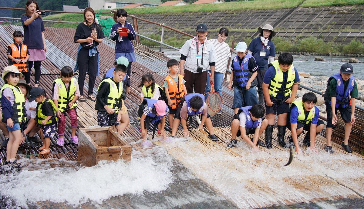 「簗(やな)」と呼ばれる仕掛けでアユを捕らえる「簗漁」を体験するイベントが28日、島根県美郷町都賀西の江の川であった。町内の子どもたちが、簗に打ち上げられたアユを手で捕まえ、地元の伝統漁法に触れた。