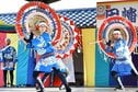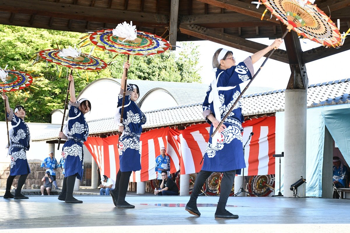 出演した北海道美唄(びばい)市の峰延東(みねのぶひがし)傘踊り保存会の演技は、主に男性が担う鳥取と違って女性が担い、両手を背に回して後ろ手で傘を操る所作がある。女性4人がりんとした演技を見せた。