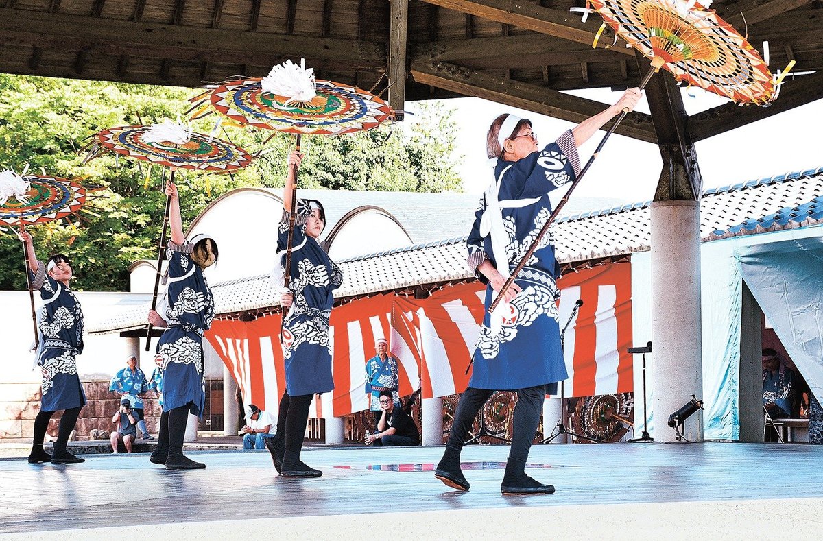 出演した北海道美唄(びばい)市の峰延東(みねのぶひがし)傘踊り保存会の演技は、主に男性が担う鳥取と違って女性が担い、両手を背に回して後ろ手で傘を操る所作がある。女性4人がりんとした演技を見せた。