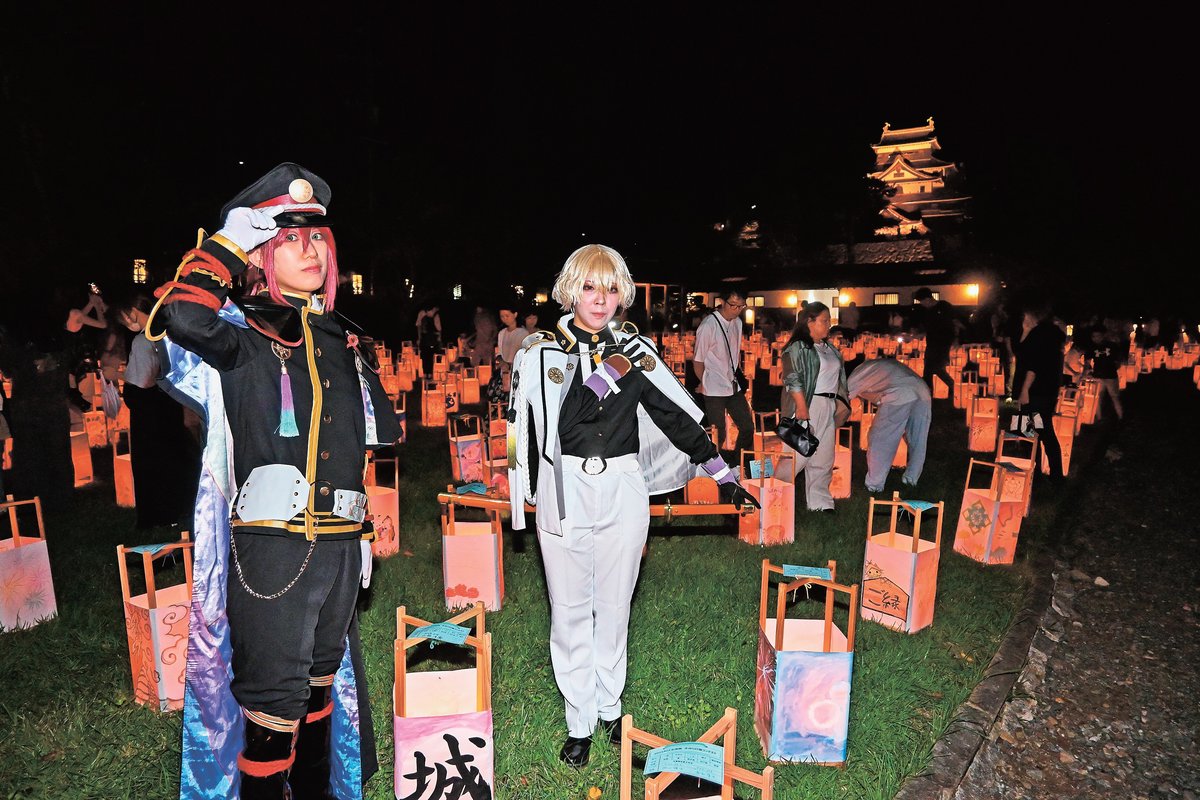 松江水燈路の開始に合わせこのほど、松江城(松江市殿町)周辺でコスプレイベントがあった。県内外から訪れた参加者が、ライトアップされた天守を背景に「刀剣乱舞」や「鬼滅の刃(やいば)」のキャラクターになりきり、撮影を楽しんだ。
