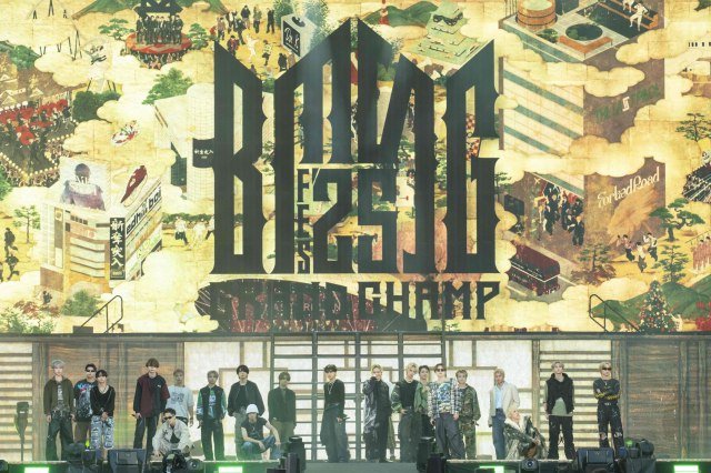 約4万人で埋まった会場に『BMSG FES’25』のテーマソング「GRAND CHAMP」のイントロが流れた。ステージから火柱が上がり、SKY-HI、RUI(STARGLOW)、JUNON(BE:FIRST)…とBMSG ALLSTARSがマイクを繋いでいく。これまでの軌跡のすべてを祝うと同時に、「まだ始まったばかり、ここからが本番」という挑戦者のアティチュードを表明した楽曲だ。ビジョンにBMSGの5年の歩みをイラスト化した「BMSG 5周年絵巻」が映る中、早速総勢21人の個性が眩い輝きを放つ。SKY-HIが「BMSG FES 2025、始めるぜ!」と開幕宣言。そのままSKY-HIをはじめとするBMSG所属のソロアーティストからなるクルー、BMSG POSSEの「MINNA BLING BLING」へ。