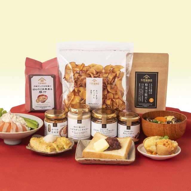 今回の福袋には、粒感と辛味が特徴の「至高のひと時 大人のしゃけしゃけめんたい」や、「秋田で燻された いぶりがっこタルタル」、「北海道産小豆のあんバター」など、リピーターの多い人気商品がラインアップ。豚汁のフリーズドライスープや、万能だし、さつま芋チップスなど、久世福らしい“和のこだわり”が詰め込まれている。